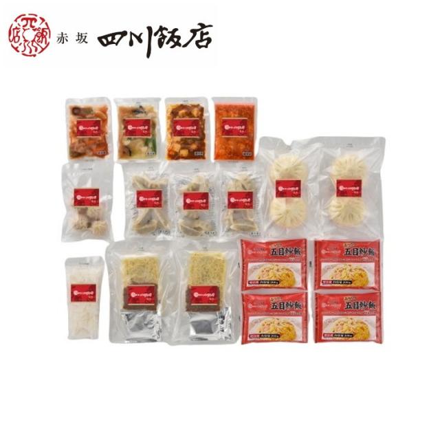 内容量:餃子120g(6個入)×3、本格四川麻婆豆腐150g×1、乾焼蝦仁(エビチリソース)150g×1、本格八宝菜150g×1、酢豚150g×1、小籠包(4個入)140g×1、手包み肉まん240g(2個入)×2、ふっくら五目炒飯(200g×2)×2、担々麺セット326g(麺200g、ごまだれ38g、液体スープ58g、ザージャン(肉みそ)30g入)×2、杏仁豆腐500g×1
