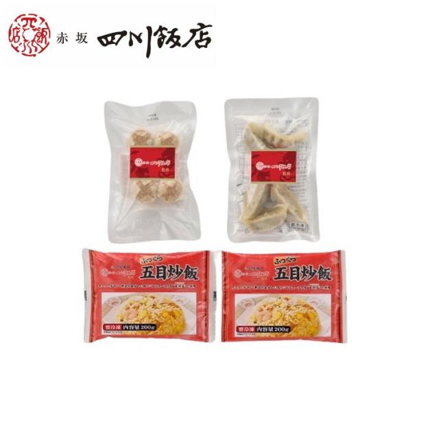 内容量:餃子120g(6個入)×1、貝柱入焼売120g(4個入)×1、ふっくら五目炒飯(200g×2)×1 ※パッケージデザインが変更になる場合がございます。