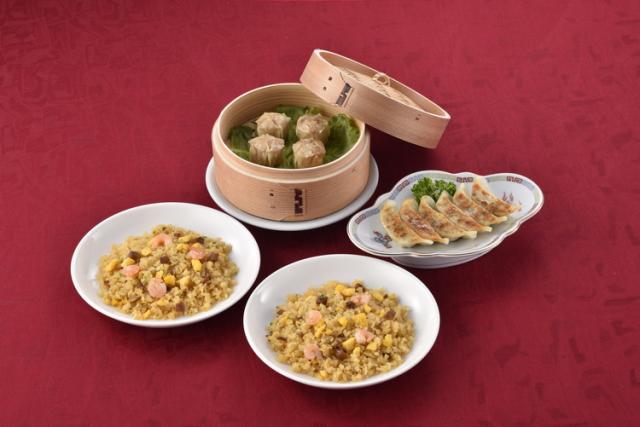 原材料(アレルギー表記含む):【餃子】野菜[キャベツ(国産)、白菜、にら、長ねぎ、にんにく、しょうが、玉ねぎ]、豚肉、ラード、豚脂、粒状大豆たん白、オイスターソース、植物油(ごま油、大豆油)、しょう油、チキンパウダー、でん粉、味噌、昆布茶、ゼラチン、砂糖、食塩、香辛料、焼酎、皮(小麦粉、還元水飴、大豆油、こんにゃく粉)/酒精、トレハロース、調味料(アミノ酸等)、重曹、カラメル色素、香料、酸味料、(一部に小麦・豚肉・大豆・ごま・鶏肉・ゼラチンを含む)【貝柱入焼売】豚肉(アメリカ産)、玉ねぎ、粒状大豆たん白、でん粉、豚脂、オイスターソース、砂糖、しょう油、大豆油、干し貝柱、ごま油、食塩、香辛料、皮(小麦粉、食塩)/調味料(アミノ酸等)、セルロース、カラメル色素、酸味料、(一部に小麦・大豆・豚肉・ごまを含む)【ふっくら五目炒飯】精白米(国産)、炒り玉子、えび、焼豚、鶏卵、ねぎ、乾しいたけ、しょうゆ、中華スープの素、砂糖、食塩、食用油脂、香味油、粉末しょうゆ、でん粉、香辛料、いため油(なたね油、食用調合油)/調味料(アミノ酸等)、加工でん粉、着色料(カラメル、クチナシ)、pH調整剤、香辛料抽出物、(一部に小麦・卵・えび・ごま・大豆・鶏肉・豚肉含む)