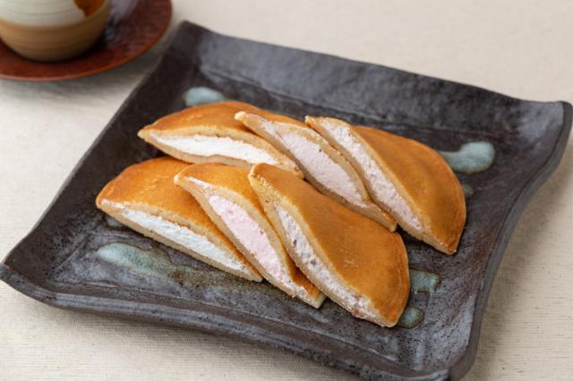 もち粉と小麦粉の絶妙な配合により生み出されたもっちり生地のどら焼きです。シンプルで程よい甘さに仕上げたクリーム味、上品でさわやかな酸味が、お口いっぱいに広がる苺クリーム、北海道産小豆をふっくら焚き上げて作った粒あんを練りこんだ小豆クリームの3種類のセットです。