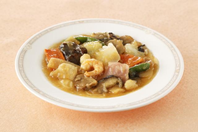 原材料(アレルギー表記含む):魚介類(イタヤ貝、えび、いか)、野菜(白菜(国産)、いんげん、たけのこ、にんじん)、豚肉、きくらげ、ポーク・チキンエキス、マッシュルーム、ふくろたけ、大豆油、清酒、ハム、しいたけ、コーンスターチ、醤油、食塩、オイスターソース、香味油、砂糖、中国醤油、チキンパウダー、香辛料/増粘剤(加工でん粉)、調味料(アミノ酸等)、着色料(コチニール、ラック、カラメル)、香料、酸味料、発色剤(亜硝酸Na、硝酸K)、(一部に小麦・卵・乳成分・えび・大豆・豚肉・いか・鶏肉・りんごを含む)