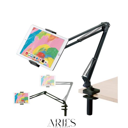 長いフレキシブルアームとボールジョイントでタブレットを自在に位置調整できるフレキシブルアームスタンドです。