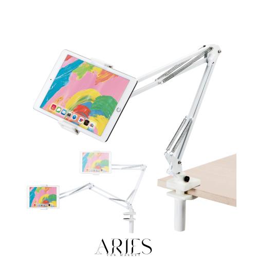 長いフレキシブルアームとボールジョイントでタブレットを自在に位置調整できるフレキシブルアームスタンドです。