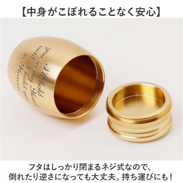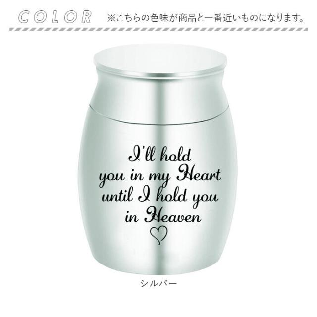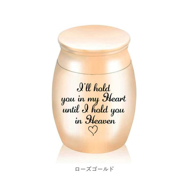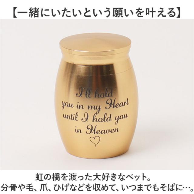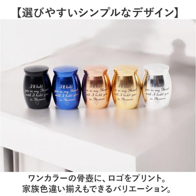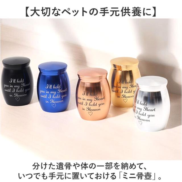 | 商品説明 | 【大切なペットの手元供養に】 ・分けた遺骨や体の一部を納めて、いつでも手元に置いておける「ミニ骨壺」。 【一緒にいたいという願いを叶える】 ・虹の橋を渡った大好きなペット。分骨や毛、爪、ひげなどを収めて、いつまでもそばに…。 【手のひらに収まるミニサイズ】 ・置き場所にも困らず、家族それぞれ持っておきたい時にもおすすめのサイズ感。 【丈夫で長期保管できる金属製】 ・サビや傷に強く、耐久性の高い素材。落としてしまっても割れる心配が不要。 【中身がこぼれることなく安心】 ・フタはしっかり閉まるネジ式なので、倒れたり逆さになっても大丈夫。持ち運びにも! 【選びやすいシンプルなデザイン】 ・ワンカラーの骨壺に、ロゴをプリント。家族色違い揃えもできるバリエーション。 |