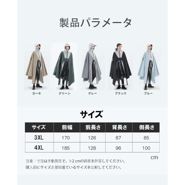注意事項:レインコートを1年間保管する場合は、できるだけ湿気を避け、使用後は風通しの良い場所でハンガーにかけ、涼しい場所に保管してください。その後、軽く折りたたんで乾燥させてください。男女兼用レインコート、サイズ感に個人差があるため、必ずサイズ表をご確認のうえ、ご注文ください。