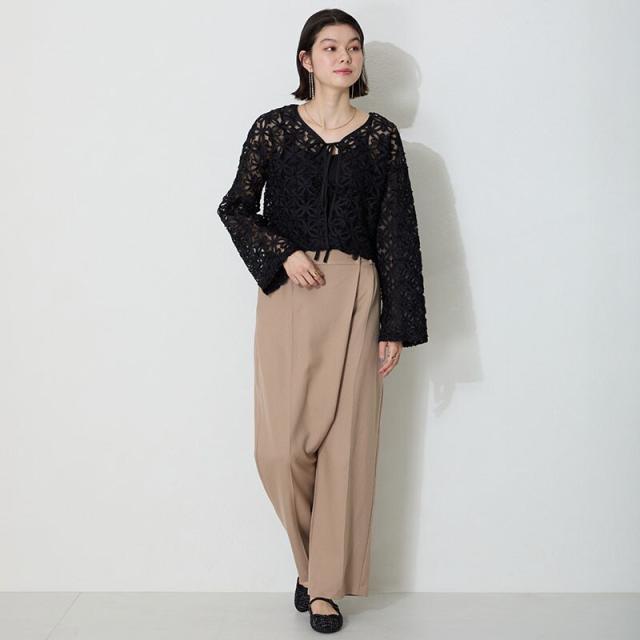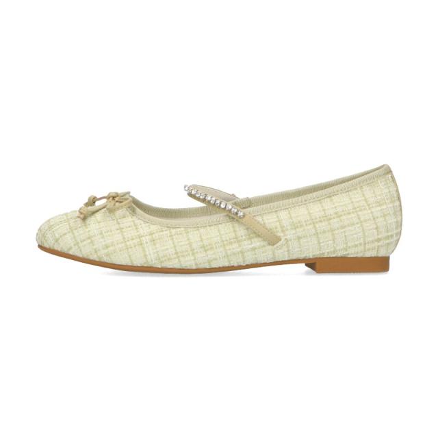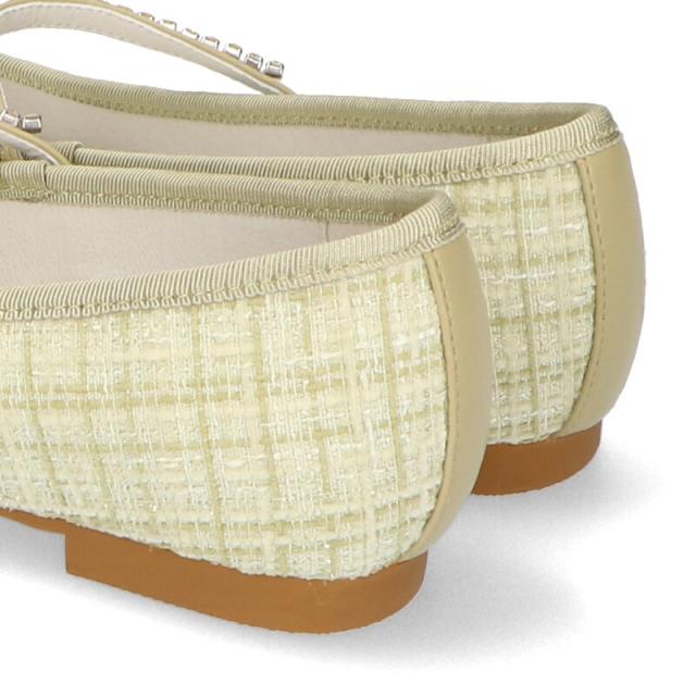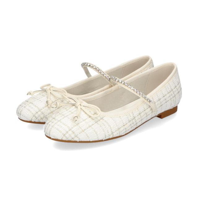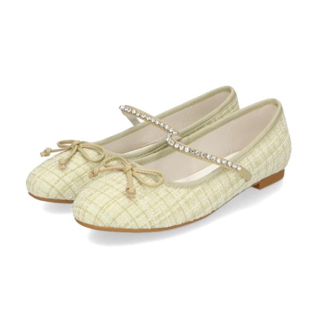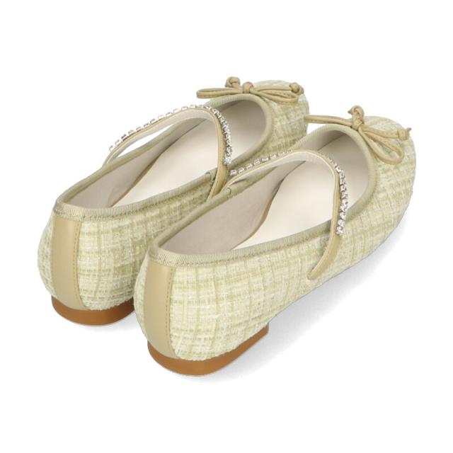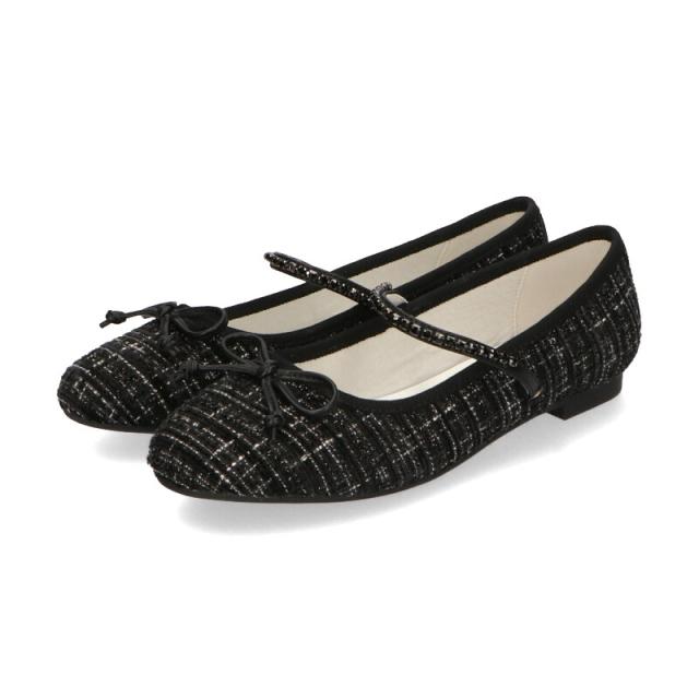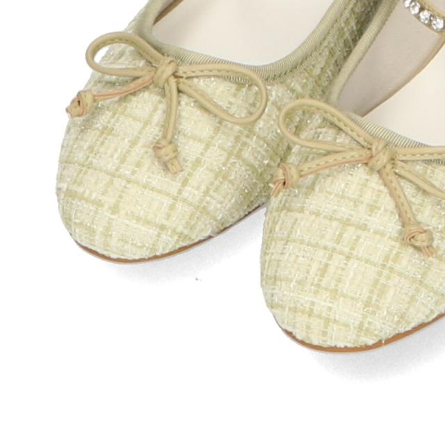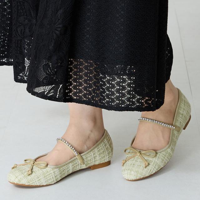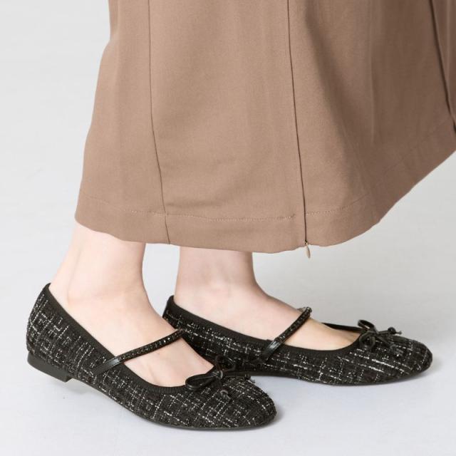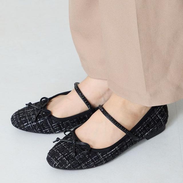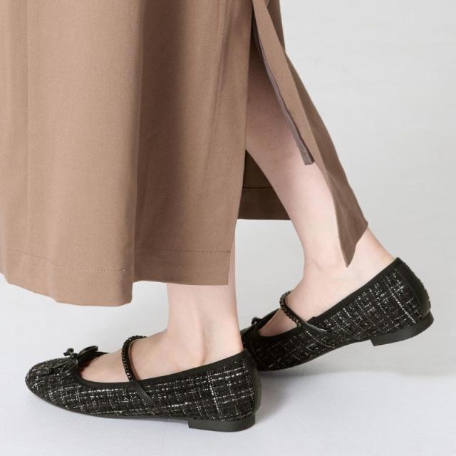 ラメツイードが可愛らしいバレエパンプスはストラップに一列のビジューを施して華やかさをアップさせ特別感のあるアイテム。