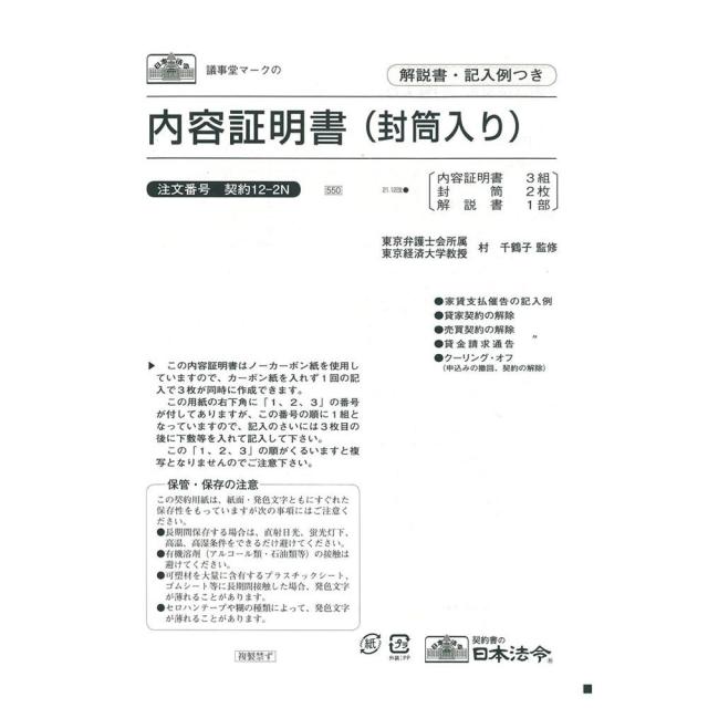 契約 12-2N/内容証明書 (封筒入)(ノーカーボン・3枚複写) B4 3組 内容証明の解説書、記入例がついています。