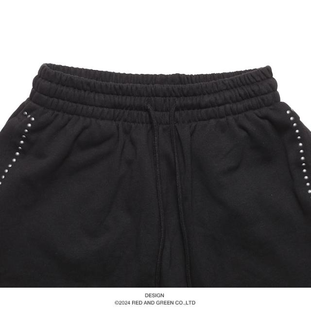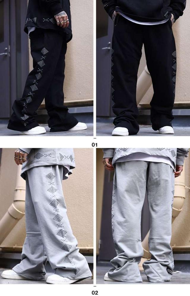 スタッズをドロップしたフレアタイプのスウェットロングパンツ。