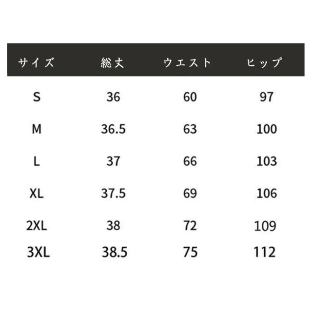 | サイズについての説明 | S総丈34 ウエスト64 ヒップ92 M総丈35 ウエスト68 ヒップ96 L総丈36 ウエスト72 ヒップ100 XL総丈37 ウエスト76 ヒップ104 2XL総丈38 ウエスト80 ヒップ108 |