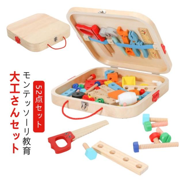 モンテッソーリ 工具おもちゃ 大工さんセット おもちゃ 知育玩具 女の子 ままごと 男の子 知育玩具 52点セット 木のおもちゃ 大工さんごっこ 組み立て ごっこ遊び 子供人気 玩具DIY 工具 ツールボックス 木製おもちゃ 収納ボックス付き 誕生日 クリスマス
