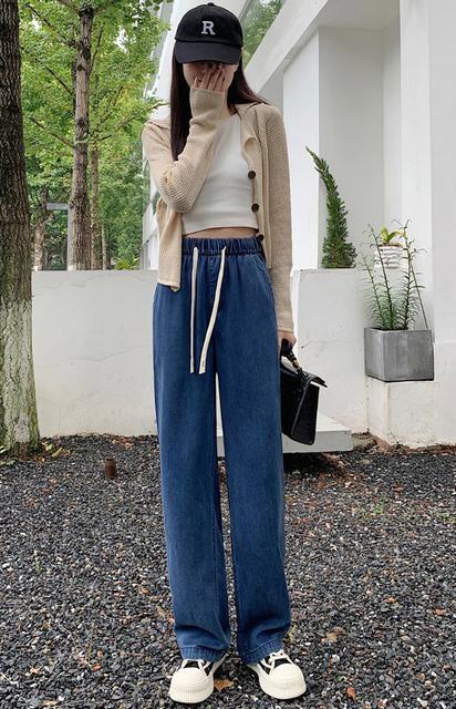 レディース ストレート ワイド 涼感 デニム ひんやり ゆるい ウェストゴム きれいめ 黒 ブルー ジーンズ ロング丈 ブルー