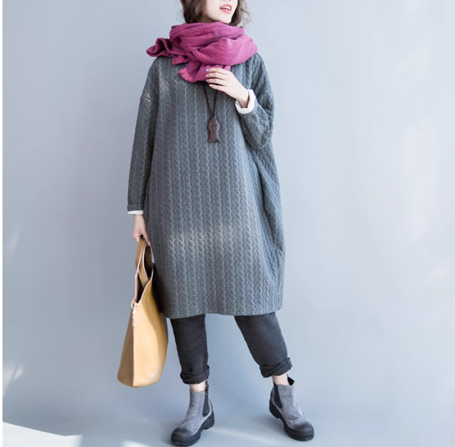 チュニック レディース ワンピース 春 秋 冬 長袖 トップス Aライン 無地 体型カバー ワンピース ゆったり シンプル グレー