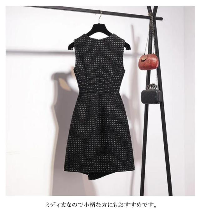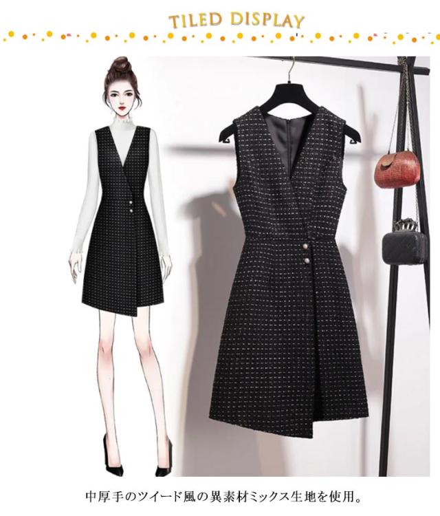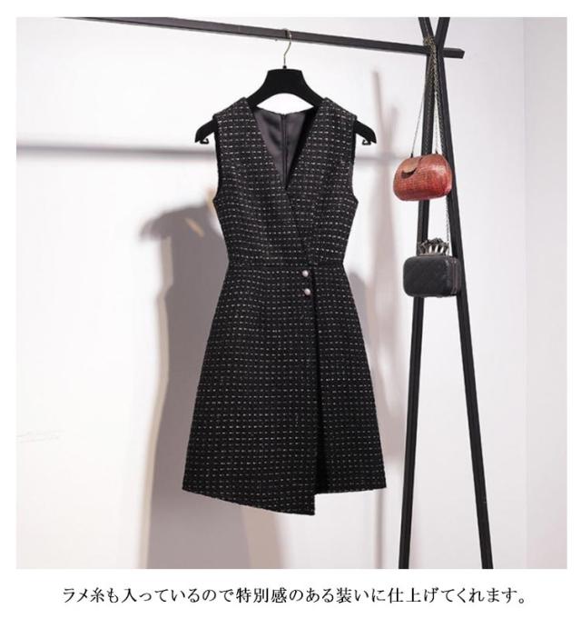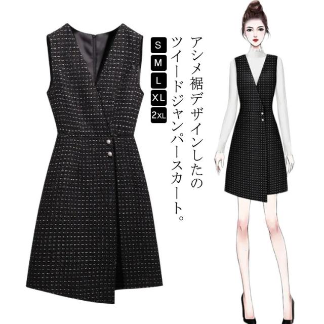 ツイード アシメ レディース パール付き 50代 Vネック 秋 Aライン ノースリーブ ツイード 大人 冬 ジャンスカ ラメ糸入り ジャンパースカート 厚手 裏地付き きれいめ 通勤 オフィス セレモニー 春 レイヤード 重ね着 コーデ オールインワン おしゃれ