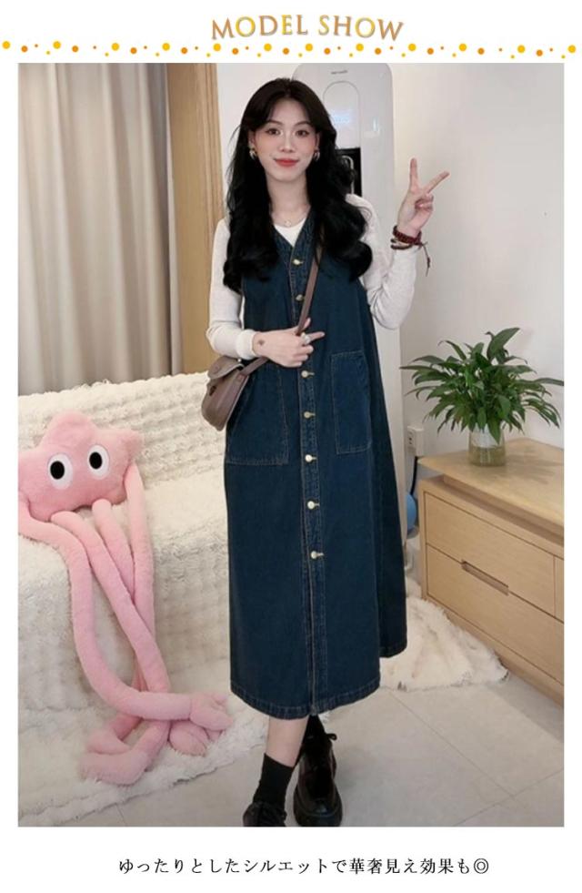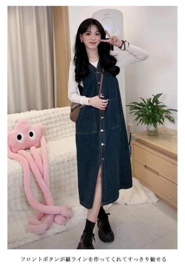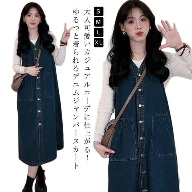 ジャンパースカート 冬 ノースリーブ デニムワンピース デニム レディース Vネック 秋 大人 ロングワンピース ジャンスカ 体型カバー ゆったり 厚手 フロントボタン カジュアル ヴィンテージ ロング デニム レトロ レイヤード 重ね着 コーデ オールインワン おしゃれ