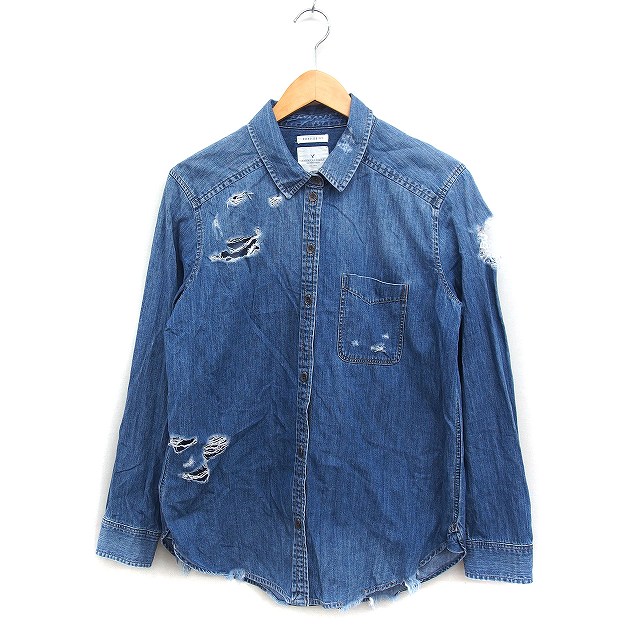 【中古】アメリカンイーグル アウトフィッターズ AMERICAN EAGLE ダメージ デニム シャツ 長袖 M ブルー 青 /FT39 レディース