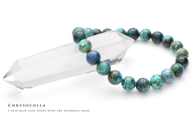 満たされない思いやストレスにもおすすめの石です。またクリソコラは、イマジネーションを引き出し美意識を高めるとされ、洗練されたアイディアや創造力をもたらすとされる石でもあります。また、豊かさや幸運を呼び込むとされる「金の石」としても有名なので、経営者や役職に就く方のサポートするといわれるパワーストーンです。
