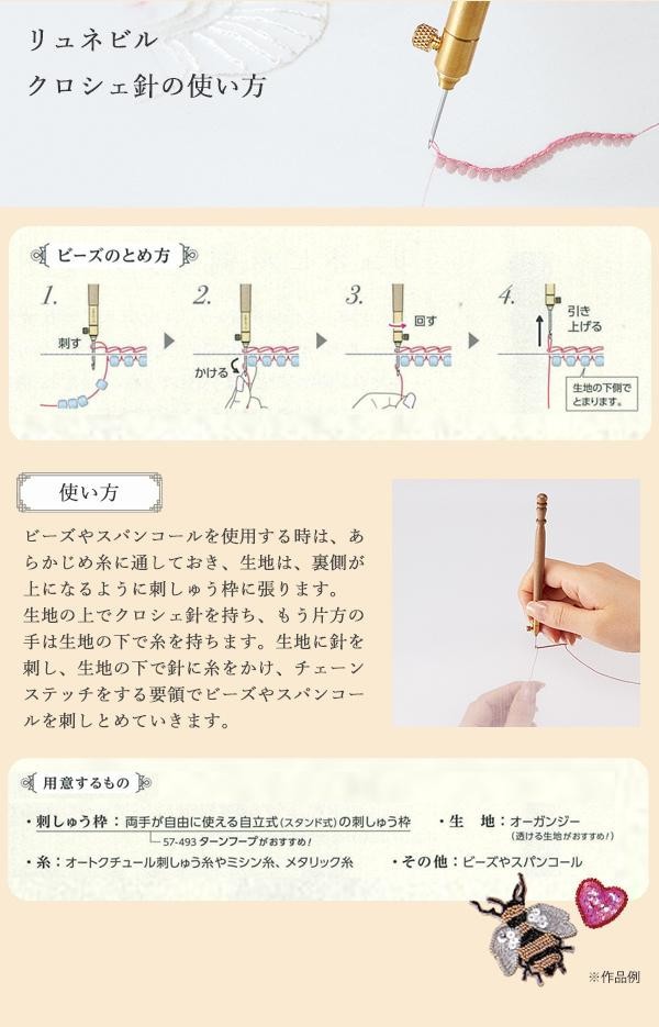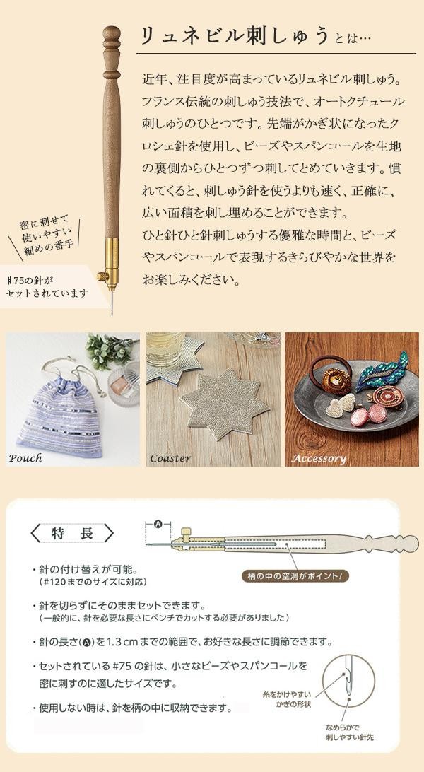 商品詳細:ひと針ひと針丁寧に刺し進める、豪華で繊細な「リュネビル刺しゅう」が楽しめます。 生産国:日本 素材・材質:柄:天然木ネジ・金具:真鍮針:鋼(クロムメッキ) 商品サイズ:使用時全長:約130mm セット内容:リュネビルクロシェ針×1本(♯75の針がセットされています)