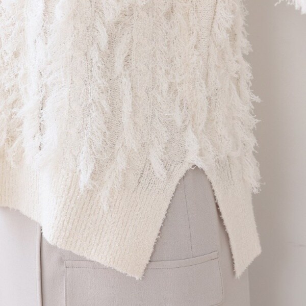 毛足の長いフリンジを全面にあしらい、シンプルなシルエットながらも印象的なスタイリングに仕上がります。