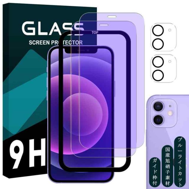 対応 iPhone 12 ガラスフィルム ブルーライトカット 【 2+2枚セット 国産旭硝子素材 ガイド枠付き】 iphone 12 フィルム (2枚) + レンズフィルム (2枚) apple iphone 12 強化ガラス ブルーライト ガイド枠 さらさら アイフォン12 保護フィルム あいほん12 レンズ保護 ケース 【 ラウンドエッジ加工 2.5D 薄型 0.26mm HD 表面硬9H 耐衝撃 飛散防止 耐久性 撥油性 疎水性 指紋防止 高感度 貼り付け簡単 自動吸着 気泡ゼロ 】 iphone12 スマホ 保護シート
