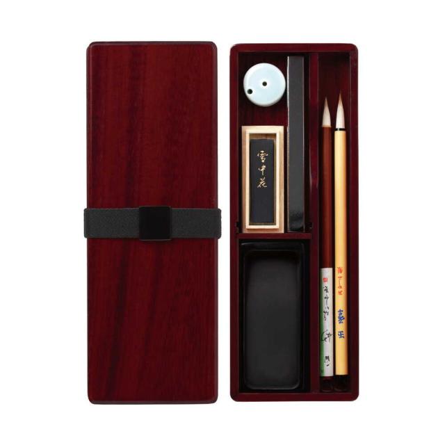 書道具、習字セット、携帯用、コンパクト、プレゼント、ギフト、贈答用、化粧箱入り、漆塗り、越前漆器、赤色、えんじ色、シンプル、無地、文房具、父の日、母の日、細字書道、写経、