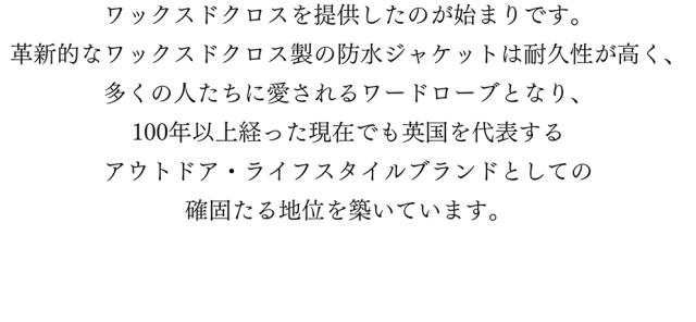 何といってもクラシックなワックスジャケットが有名で、一部の製品は現在でもイギリス内の工場で手作業で製造されています。