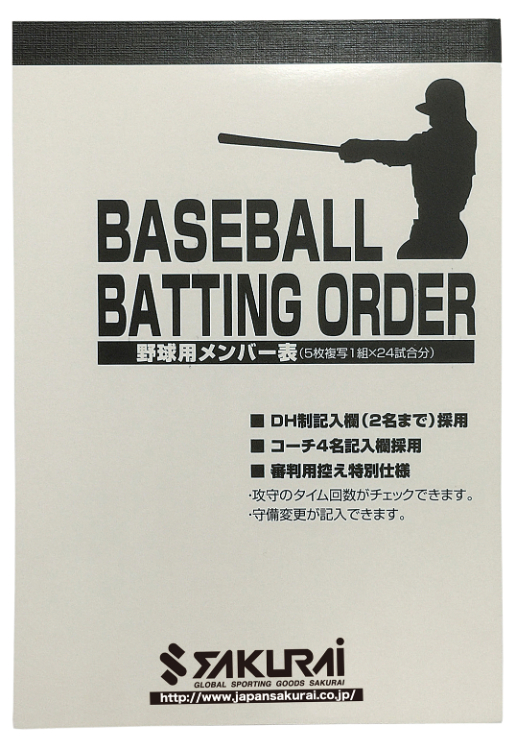●5枚綴り複写x24試合分・DH制対応 パッケージサイズ:幅125x高さ180x奥行き7(mm) 重量150g 原産国:日本 ※画像はイメージです。 ※パッケージ、仕様、品番などの変更が予告なく変更される場合が御座います。 カテゴリー |