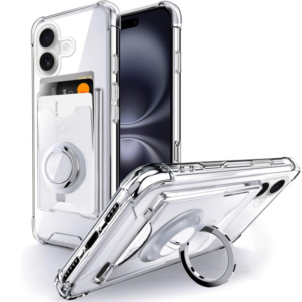 Rockaway 互換性 iPhone 16用 ケース カード収納 背面ポケット リング付き スタンド機能 耐衝撃 透明 TPU スマホケース 6.1インチ アイフォン16 用カバー - クリア