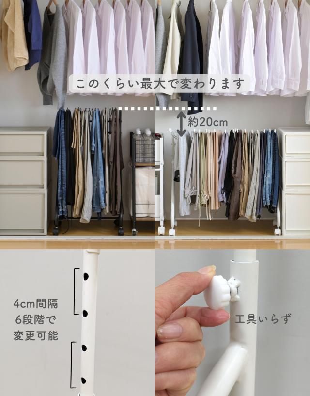 | 商品説明 | ●クローゼット下を使って、パンツをたたまず収納できるハンガーラック ●長めのボトムスも掛けられる、高さ最小70から最大90cmの伸縮式 ●デニムもOK、しっかり構造のスラックスハンガーラック ●バーはスイング式、着脱もできて出し入れラクラク ●滑り止めのシリコンキャップ付きなのでズレ落ちるストレス緩和 ●バーの高さは約4cm間隔、6段調整 ●押入れ下段にも入る高さ70cm設計(※押入れのサイズはご確認ください。) ●フレームはしっかり構造、端部はハンドルのようにつかむことも可能 ●脚部間内寸:幅40.5 奥行33cm ●スラックスバー内寸長さ:24.5cm ●床からスラックスバーまでの高さ:67-87cm ●全体耐荷重6kg(1本あたり0.6kg) ●キャスター4個(うちストッパー付き2個) |