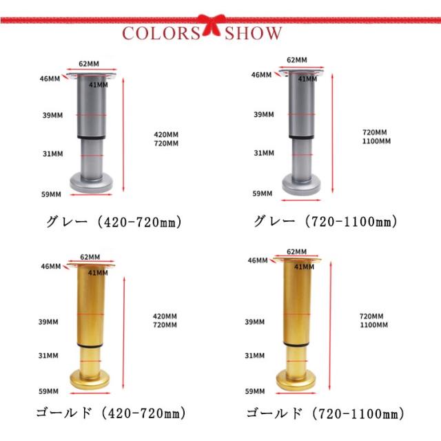 | 色 | グレー(420-720mm) グレー(720-1100mm) ゴールド(420-720mm) ゴールド(720-1100mm) ブラック(420-720mm) ブラック(720-1100mm) ホワイト(420-720mm) ホワイト(720-1100mm) |