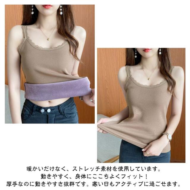 | 【裏起毛キャミソール】【ふわふわ、あったか】 ふわふわ、あったか。まるで着る毛布のような、裏起毛が付いたキャミソール。 ふっくら厚手の生地に、ぬくぬくの裏起毛素材がしっかりカラダを包み込んで寒さをブロック! 暖かいだけなく、ストレッチ素材を使用しています。動きやすく、身体にここちよくフィット!厚手なのに動きやすさ抜群です。寒い日もアクティブに過ごせます。 重ね着のインナーとしても、暖房節約対策として、あたたかい部屋着としてもおすすめ 冬でもタンクトップが活躍!ユニフォームや制服の下着に重宝します。 | |