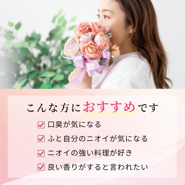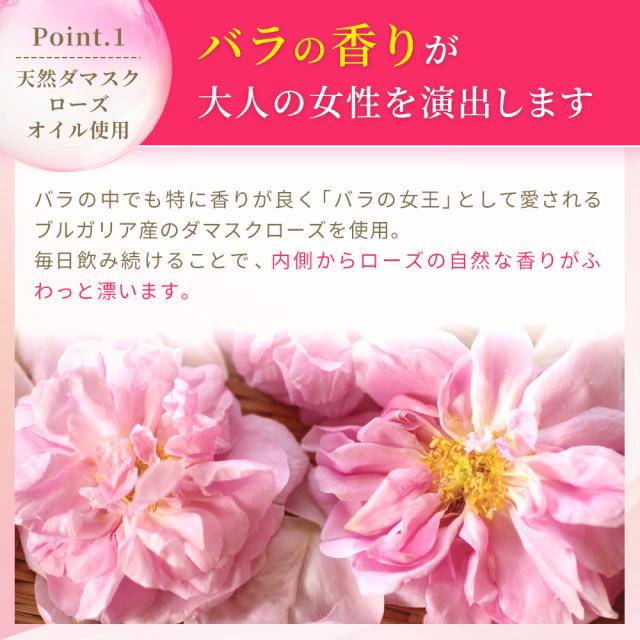 フローラルな香りをまとって、自信のある毎日に。ブルガリア産ダマスクローズを贅沢に使用したローズオイルに、トロピカルフルーツをブレンドした独自配合オイルに加え、茶カテキンを配合。美しい赤色のソフトカプセルの粒は、まるで飲むフレグランス。女性に嬉しい4つの美容成分も配合し、香りとともにあなたの魅力をサポートします。