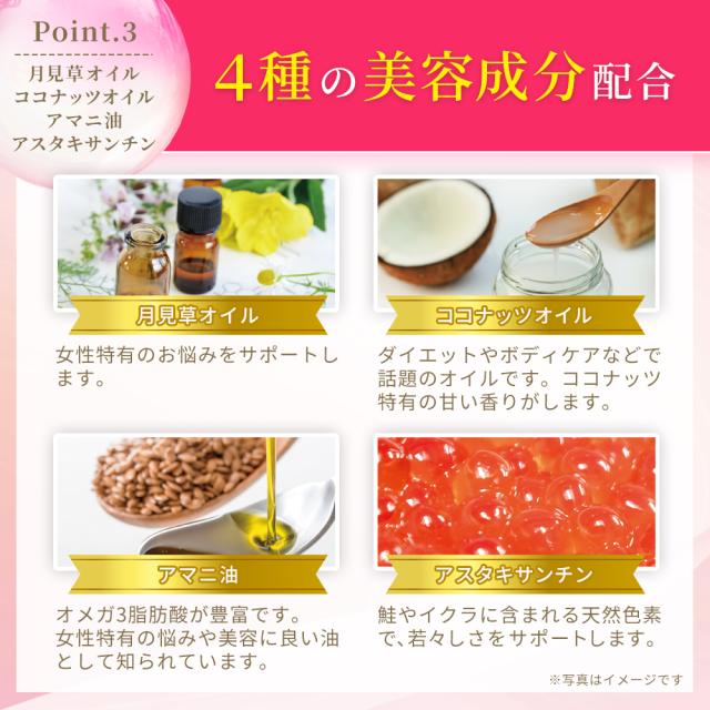 オリーブ油(スペイン製造)、月見草油、アマニ油、カテキンオイル(食用油脂、緑茶抽出物)、ココナッツオイル/ゼラチン、グリセリン、香料、ビタミンE、ヘマトコッカス藻色素、ローズ香料、ビタミンA