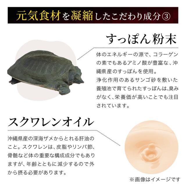 有精卵黄油(卵を含む)(国内製造)、オリーブ油、醗酵黒ニンニクパウダー、スッポン卵粉末、無臭にんにくエキス末、すっぽん粉末、スクワレン/ゼラチン、グリセリン、グリセリン脂肪酸エステル