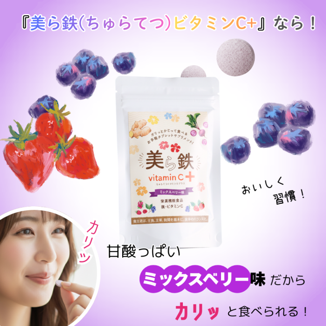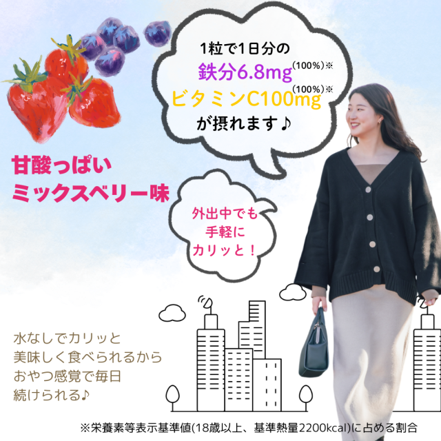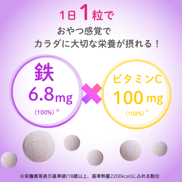 【栄養機能食品(鉄・ビタミンC)】 鉄は、赤血球を作るのに必要な栄養素です。 ビタミンCは、皮膚や粘膜の健康維持を助けるとともに、抗酸化作用を持つ栄養素です。