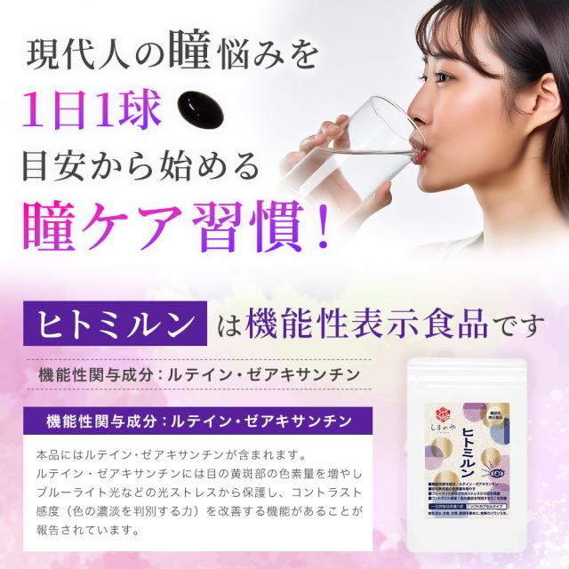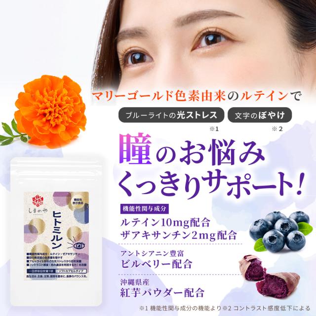 瞳サポートサプリ 30日分 機能性表示食品 30球 ルテイン ゼアキサンチン ぼやけ かすみ コントラスト感度を改善 光ストレス保護 サプリメント ヒトミルン しまのや 送料無料