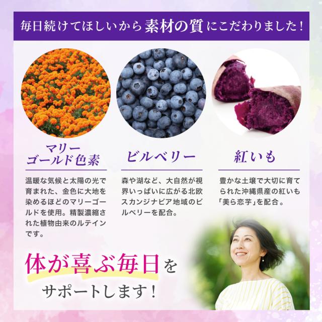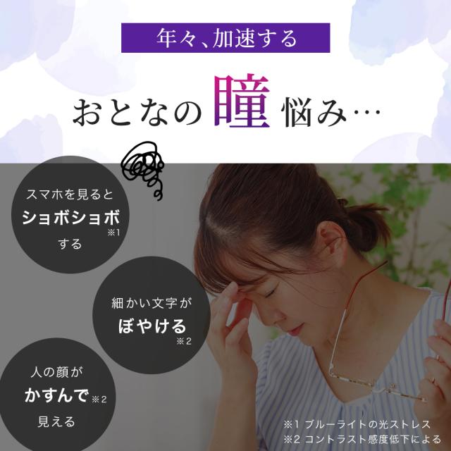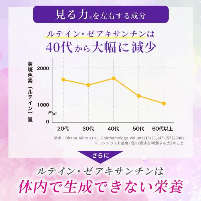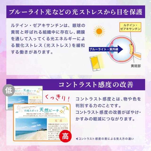 本品にはルテイン・ゼアキサンチンが含まれます。ルテイン・ゼアキサンチンには目の黄斑部の色素量を増やし、ブルーライト光などの光ストレスから保護し、コントラスト感度(色の濃淡を判別する力)を改善する機能があることが報告されています。