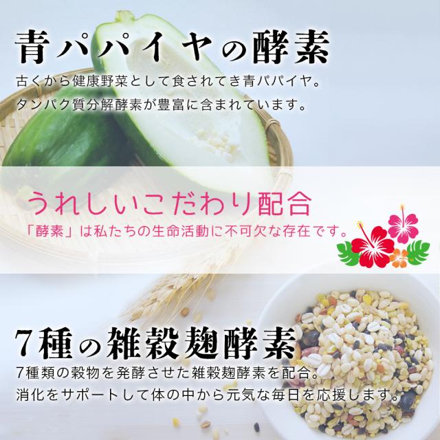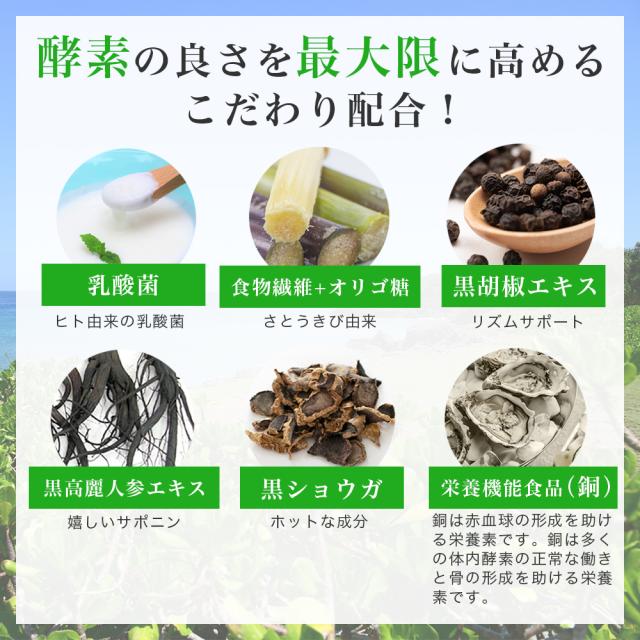 還元麦芽糖水飴(国内製造)、植物発酵エキス末(デキストリン、植物発酵エキス)、発酵バガス粉末、酵母(銅含有)、穀物麹、青パパイヤエキス末、植物抽出エキス、黒高麗人参エキス末、黒ショウガ末、黒胡椒抽出物、乳酸菌末/結晶セルロース、ステアリン酸カルシウム、微粒二酸化ケイ素、(一部に乳成分を含む)