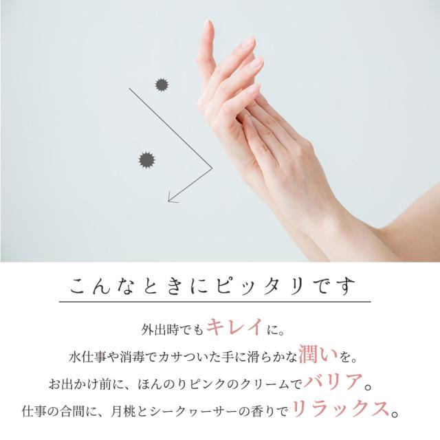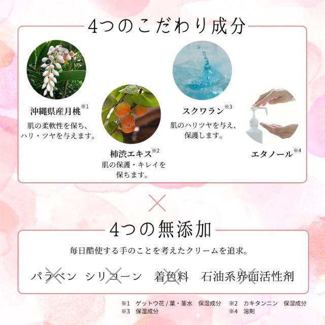 月桃、柿渋エキス、エタノールを配合。肌馴染みが良く、しっとり感がありつつもべたつかないテクスチャのクリームで保湿し、いつでもキレイな手へ。