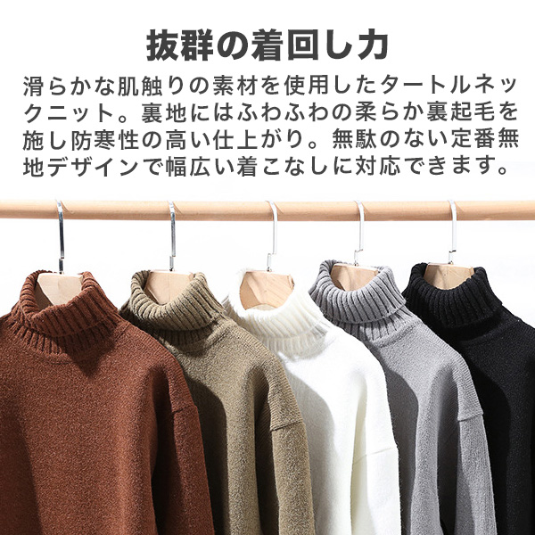 | 商品説明 | 滑らかな肌触りの素材を使用したタートルネックニット。裏地にはふわふわの柔らかな裏起毛を施し防寒性を高めた仕上がり。無駄のない定番無地デザインで幅広い着こなしに対応できます。 | |||