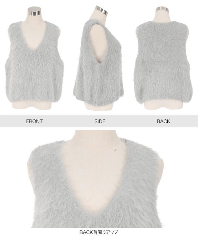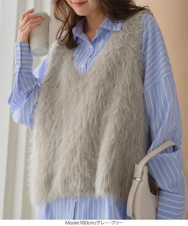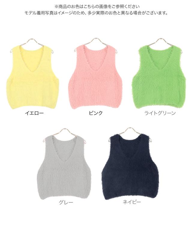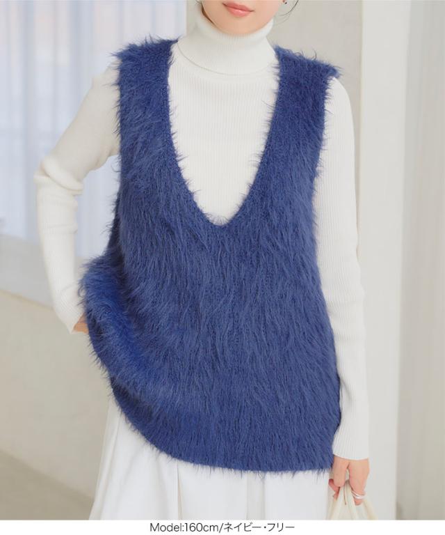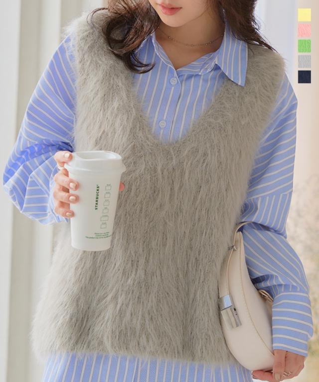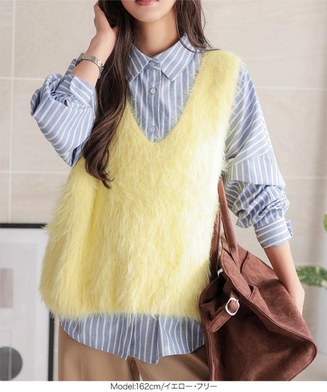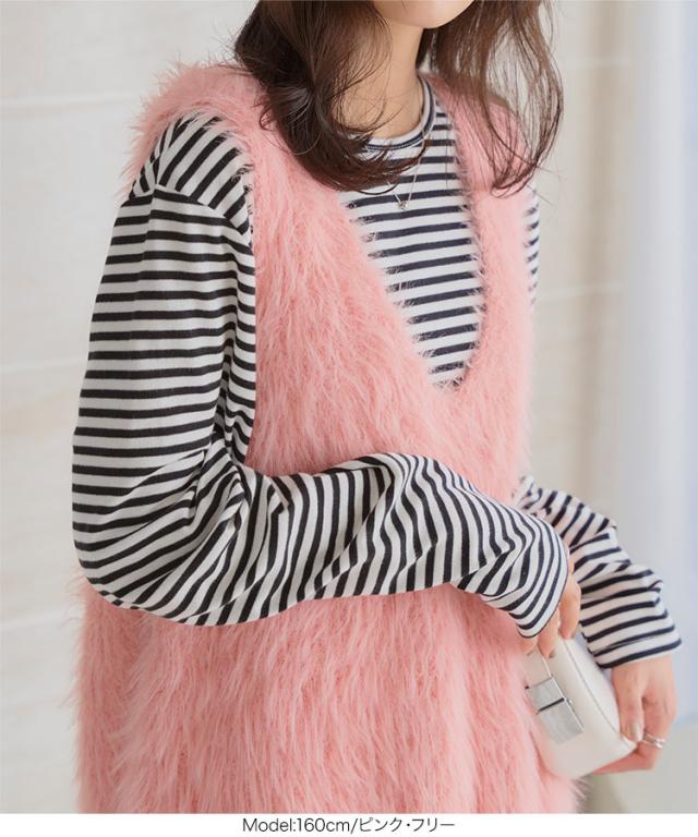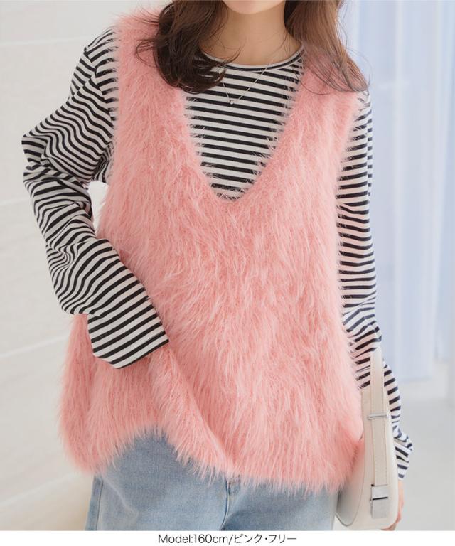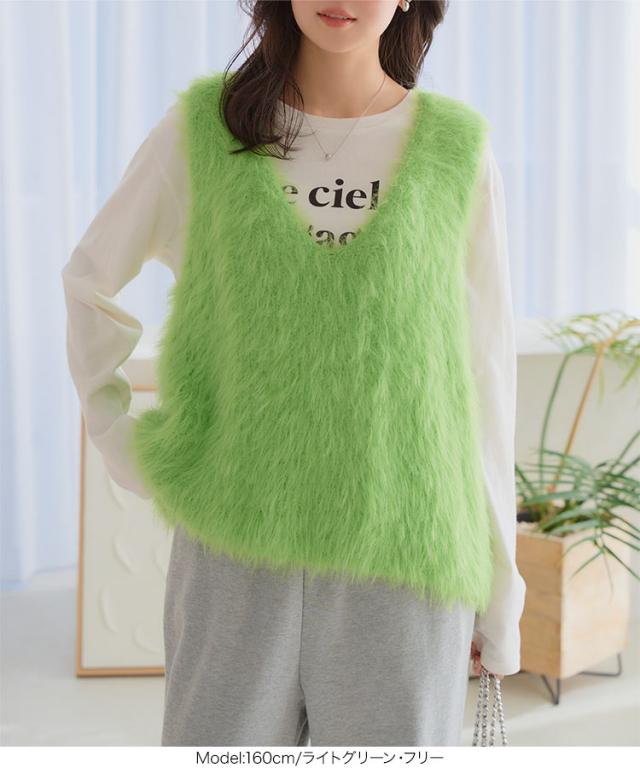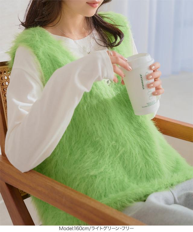 シャギーロングニットベスト N1169 入荷済 レディース 20代 30代 40代 セーター ファー ロングベスト ジレ Vネック ピンク イエロー グリーン ノースリーブ