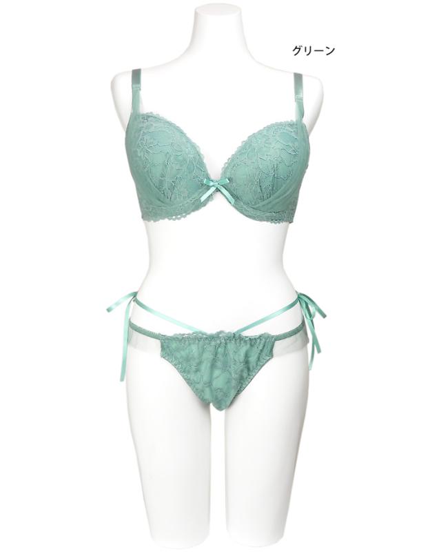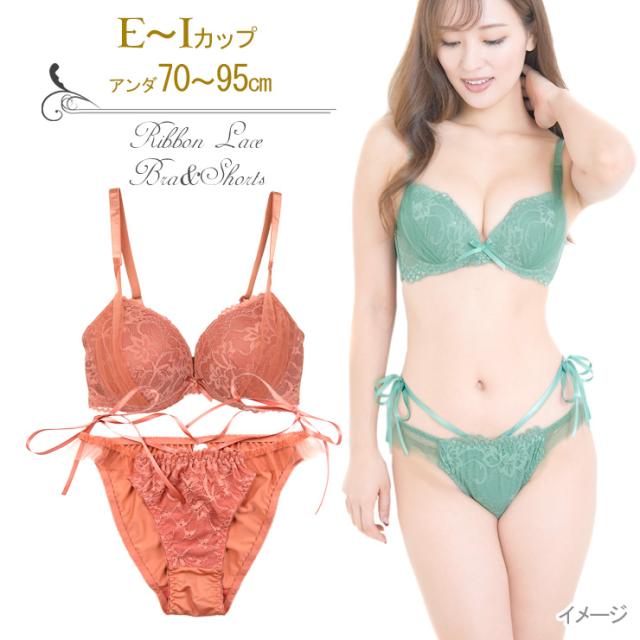 【大きいサイズ】脇高 リボンデザイン ブラジャー ショーツ セット 下着(J2141) グリーン コーラル G H I 70 75 80 85 90 95 bs2415