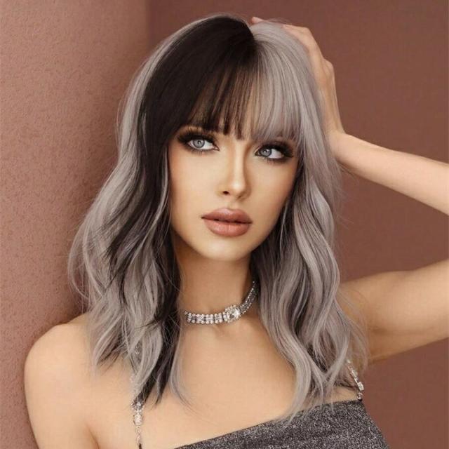 二トーントーン ウィッグ シルバーアッシュピンク カール ウィッグ 女性用ショルダーレングス ウェーブ ウィッグ バング付き 耐熱性合成繊維 美しいふわふわウィッグ 女の子 デイリーパーティ コスプレ用 初心者 誕生日プレゼント 16インチ - ブラック ハイライト付き二トーントーン ウィッグ シルバーアッシュピンク カール ウィッグ 女性用ショルダーレングス ウェーブ ウィッグ バング付き 耐熱性合成繊維 美しいふわふわウィッグ