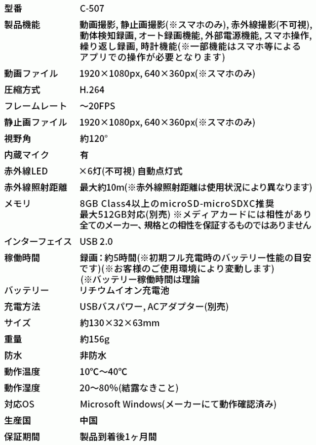・本製品は映像録画をメインとしたもので、音声につきましては、音ズレ、音量の変化、ノイズが生じます。また、専用アプリによる録画の音声につきましても、同様の症状がみられます。予めご了承ください。