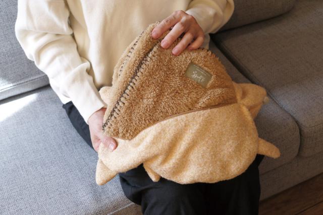 猫のカバーの背中に付いたファスナー部分から簡単に出し入れができます。シーズンオフで収納場所に困るブランケットも、カバーに入れておけばクッションとして年中活躍します。