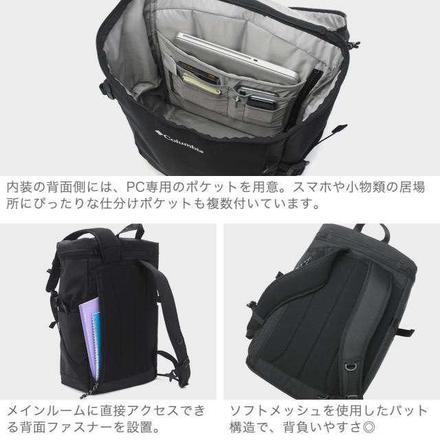 コロンビア独自開発の撥水機能『OMNI-SHIELD/オムニシールド』を搭載した撥水仕様のリュック。A3の対応の大容量サイズがポイント!16インチのPC対応スリーブも装備し、通学や旅行に最適です。