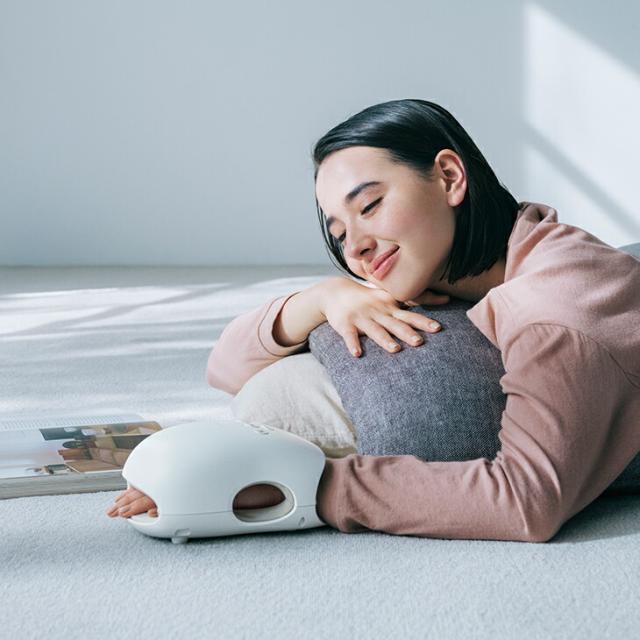 もみ、ストレッチ、ハンドトリートメント、エステティック、アクティブコースの5つのコースで疲れをほぐし、血行を促進、エステティックケアまでを網羅した、医療機器認証取得のハンドマッサージャーです。コンパクトサイズで置き場所も自由。お部屋にフィットするマット仕様のデザインです。
