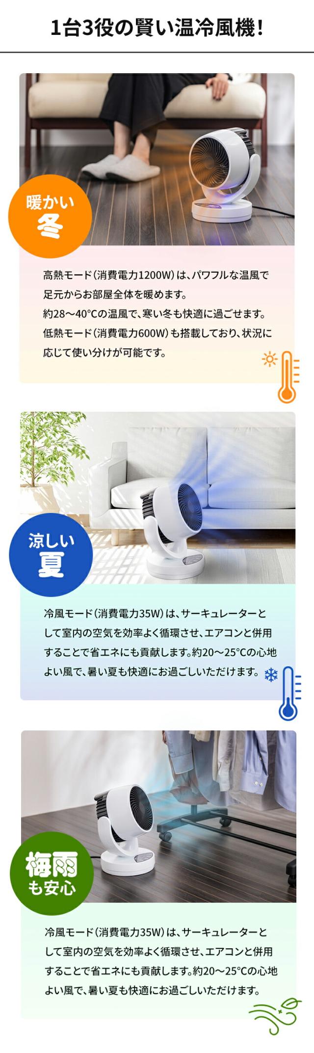2.涼しい夏に: 冷風モード(消費電力35W)は、サーキュレーターとして室内の空気を効率よく循環させ、エアコンと併用することで省エネにも貢献します。約20〜25℃の心地よい風で、暑い夏も快適にお過ごしいただけます。