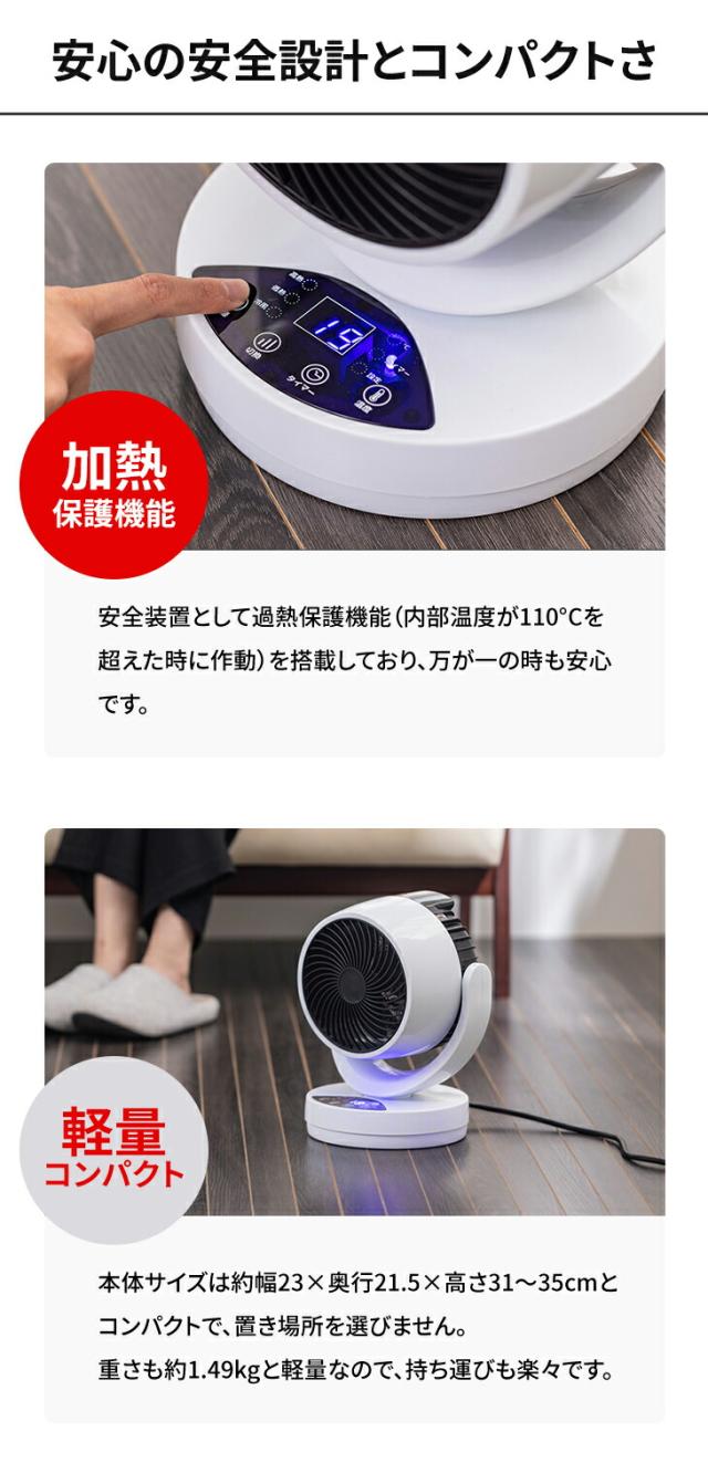 本体サイズは約幅23×奥行21.5×高さ31〜35cmとコンパクトで、置き場所を選びません。重さも約1.49kgと軽量なので、持ち運びも楽々です。安全装置として過熱保護機能(内部温度が110°Cを超えた時に作動)を搭載しており、万が一の時も安心です。