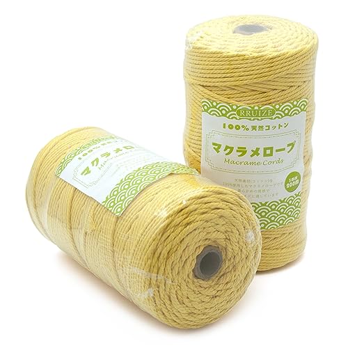 マクラメ ロープ 紐 糸 ナチュラルコットン 直径約3mm 編んで、100%天然染料使用 イェロー 200m*2