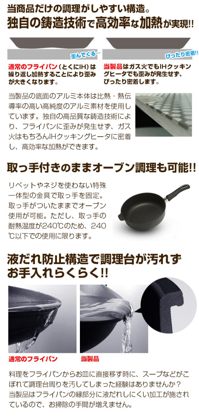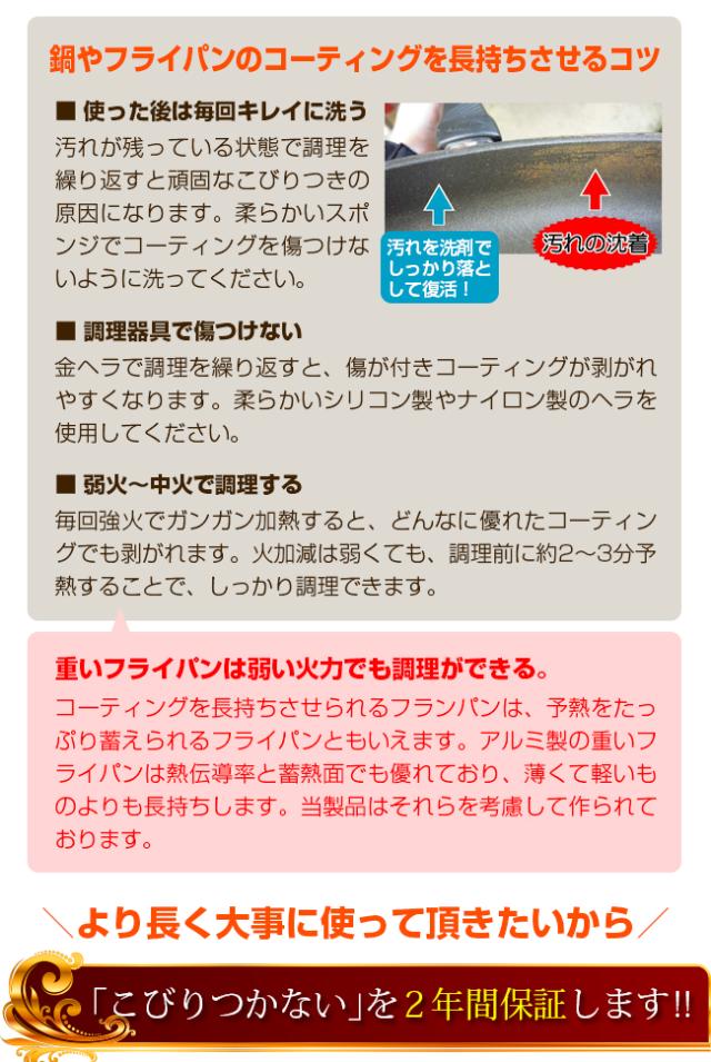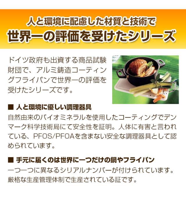 | 備考 | [表面加工]ふっ素樹脂塗膜加工 [フライパン耐熱温度]コーティング:250℃、取っ手:240℃ [蓋耐熱温度]120度 |